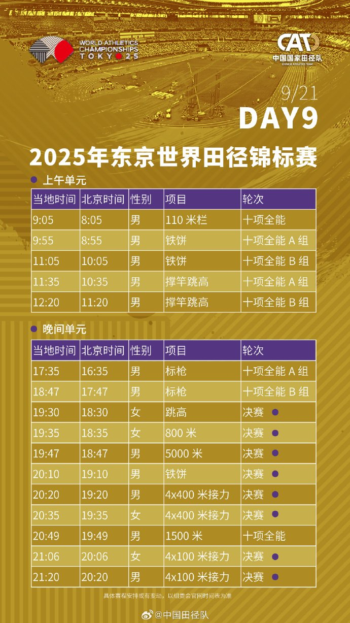 #2025东京田径世锦赛赛程# 中国田径队将派出73名运动员(男运动员41人、女运动员32人),参与田径世锦赛33个小项的比拼。